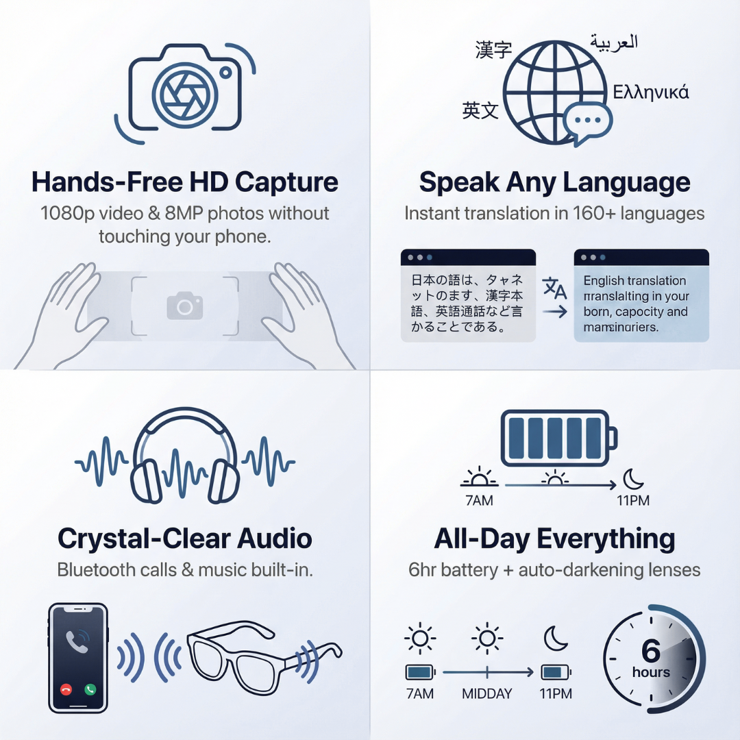 Blync aren't just smart glasses—it's freedom from your phone. Capture 1080p POV video, translate 160+ languages in real-time, take calls, and stream music without ever reaching into your pocket.